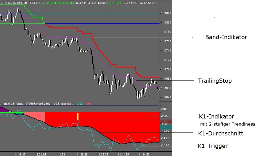Bei diesem Beispiel ist eine BreakOut-Situation und zusätzlich das K1-Band (gelb) mit TrailingStop-Linie (magenta für Short) dargestellt.