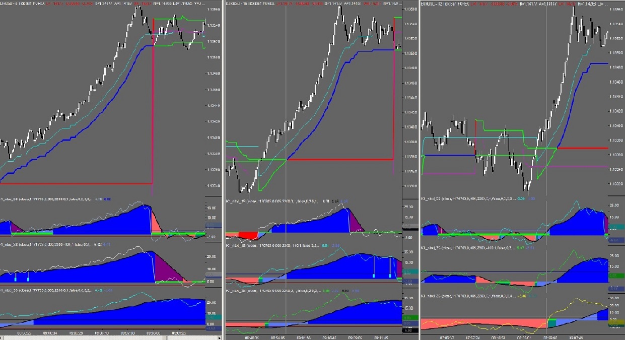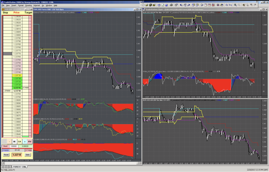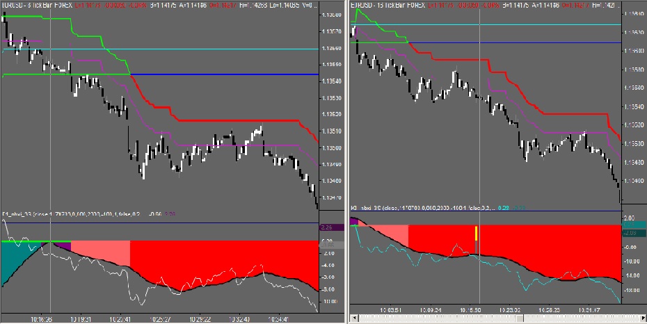 Die folgenden Beispiele von Chartfenstern unterschiedlicher Tick-Kompressionen zeigen Kombinationen des K1-Bandindikators und des K1-Triggerindikators.