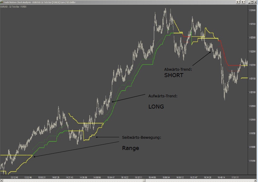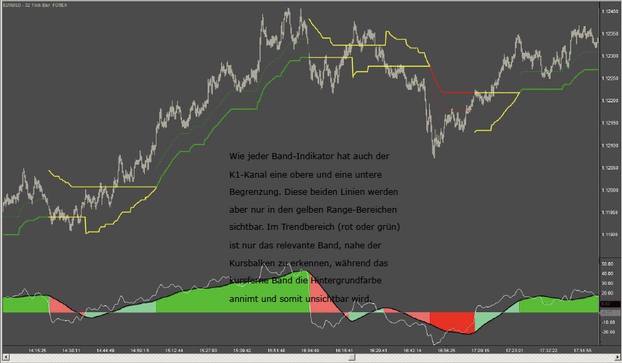 Ohne weitere Einstellungen ist damit das Instrumentarium zur Ermittlung der Einstiegspunkte vorhanden. Die Störgröße ist in wenigen Minuten gefunden, indem verschiedene Werte nacheinander eingegeben werden, bis sich zusammenhängende Range-Bereiche (gelb) zeigen. Im Indikator unter dem Chart sind diese Bereiche als grün/rotes Histogramm zu erkennen. Grün und rot sind auch die Long- und Short-Trends im K1-Band im Chart markiert.