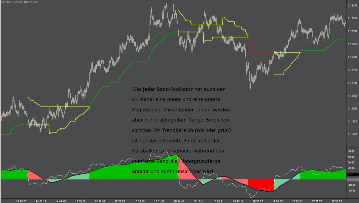 Solange der Kurs innerhalb dieser Störgröße hin- und herschwangt, wird der K1-Kanal in einer entsprechend gewählten Farbe (z.B. grün) geplottet. Verläßt der Kurs eine Range, weiten sich die Bänder des K1-Kanals und die Kursbalken liegen eng am blauen Long- oder dem roten Short-Band des K1-Kanals.
